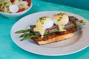 בנדיקט סינטה: נתחי סינטה עגל ואספרגוס צרובים על הגריל, מוגשים על בריוש קלוי ולביבות תפו"א עם שתי ביצים (עלומות, אלא מה) ורוטב הולנדייז. מוגש עם סלט אישי ושתייה לבחירה. 76 שקל.